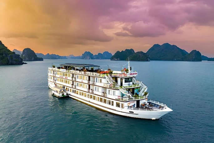 Upon arrival in Halong Bay, we will board the vessel and partake in a delectable lunch. During the meal, we will cruise through thousands of stunning islands and islets. Following lunch, you may freshen up in your room before embarking on a visit to the Surprising Cave, kayaking, swimming, and other activities. Later, return to the vessel, get a drink and enjoy the picturesque sunset scenery in the bay.