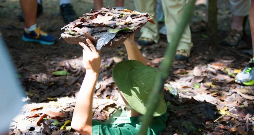 After lunch, take a bus 1.5 hours to Cu Chi Tunnels. Watch a video about tunnel construction and wartime life, then explore the tunnel systems with living areas, kitchens, bedrooms, weapons factories, hospitals, and command centers. See hidden trap doors and security traps. Try special tea and cassava, the food guerrillas ate during wartime. An optional shooting range is available.